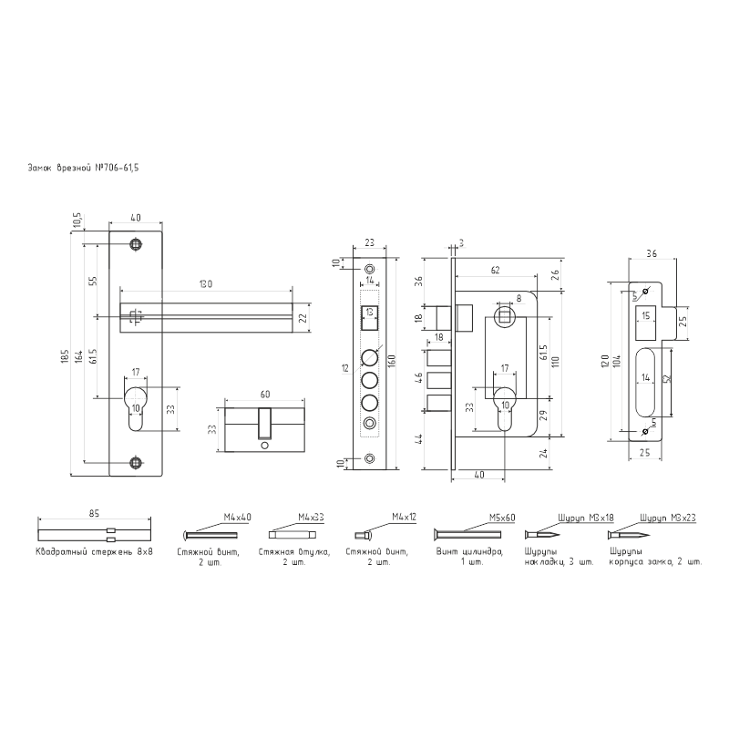 2 ручки на планке, корпус замка, цилиндровый механизм, ответная планка, 5 ключей, квадратный стержень, комплект крепежа.